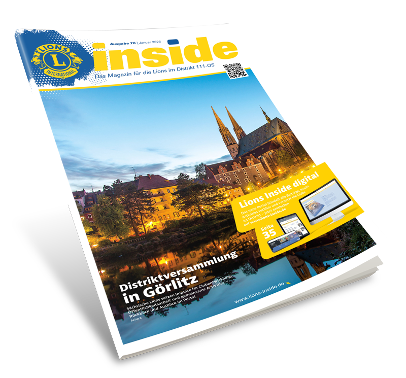 „Lions Inside“ ist das Magazin für alle Lions-Clubs im Distrikt 111-OS (Sachsen). Es berichtet über Aktionen, Projekte und Veranstaltungen der Lions und LEOs in unserer Region. Unser Ziel ist es, die Vielfalt des ehrenamtlichen Engagements sichtbar zu machen, Menschen miteinander zu vernetzen und Inspiration für neue Initiativen zu geben.