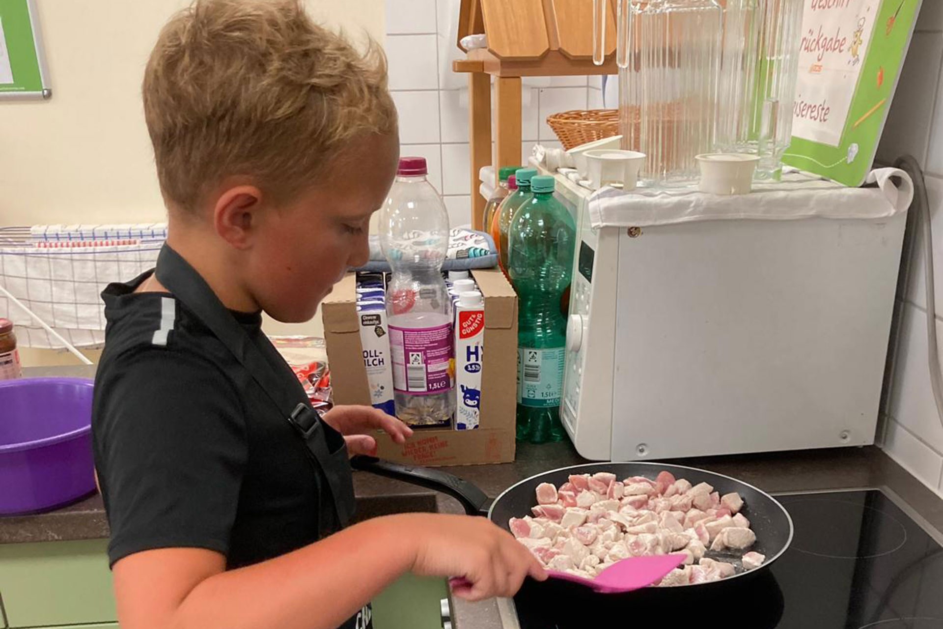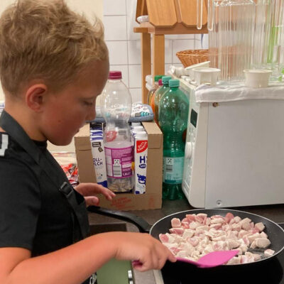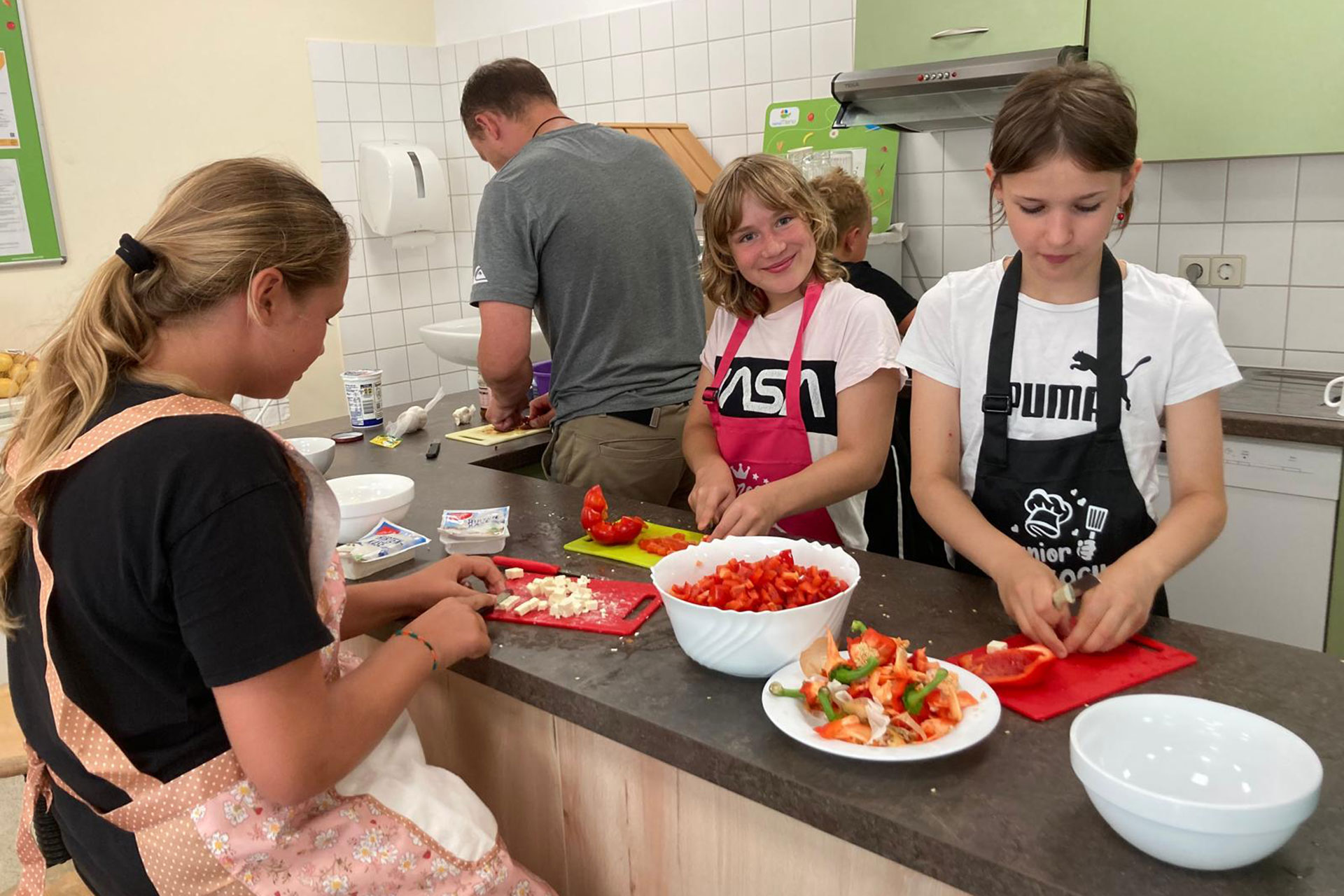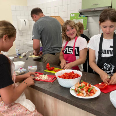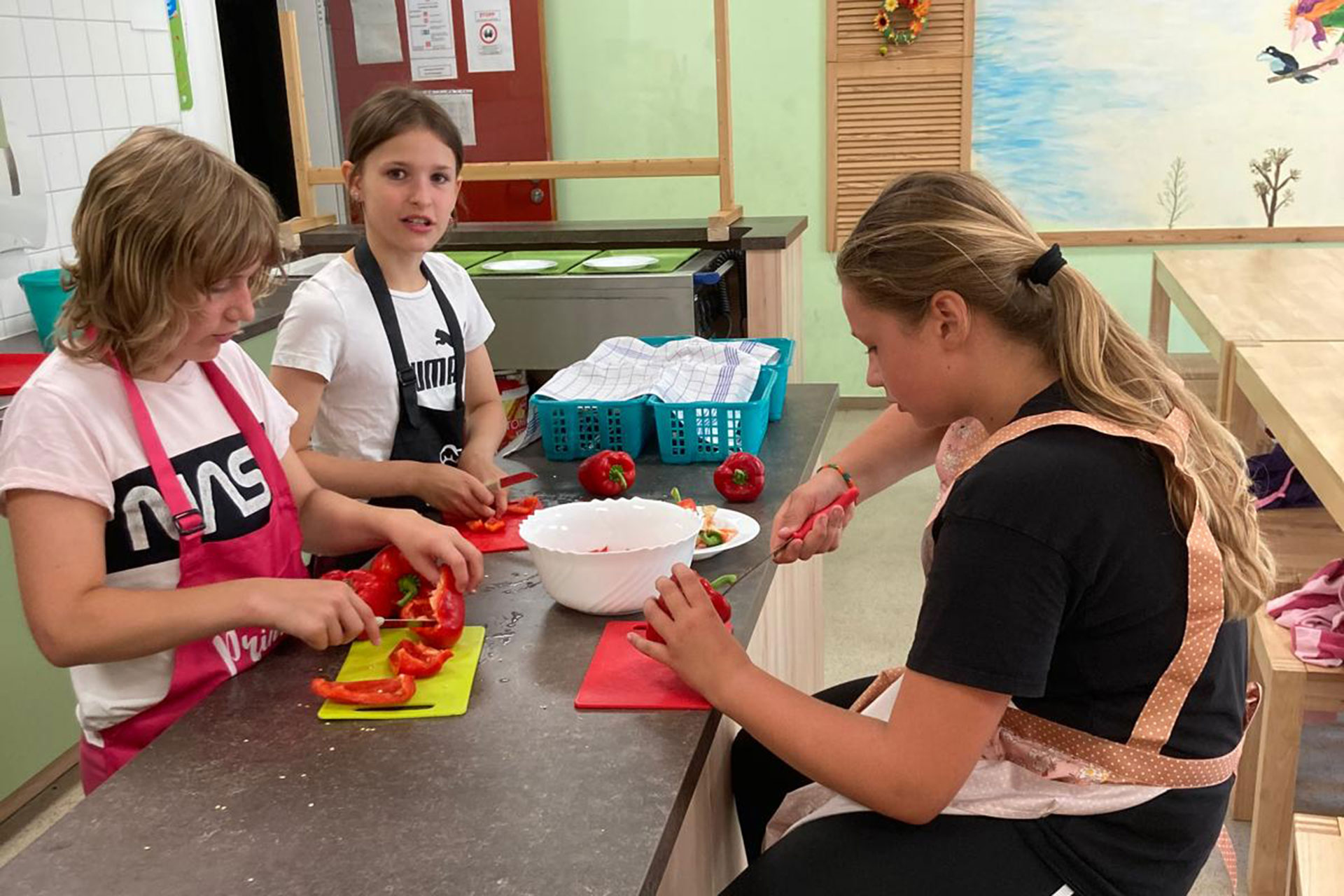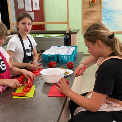 Mit großer Freude sind Schülerinnen und Schüler der Heideschule im 5. Jahr bei ihrem Projekt „Gesundes Hortessen“ am letzten Schultag vor den Sommerferien dabei, ihren selber entworfenen Essensplan umzusetzen. Es wird konzentriert geschnibbelt, geschält und gemixt, aber auch gescherzt.