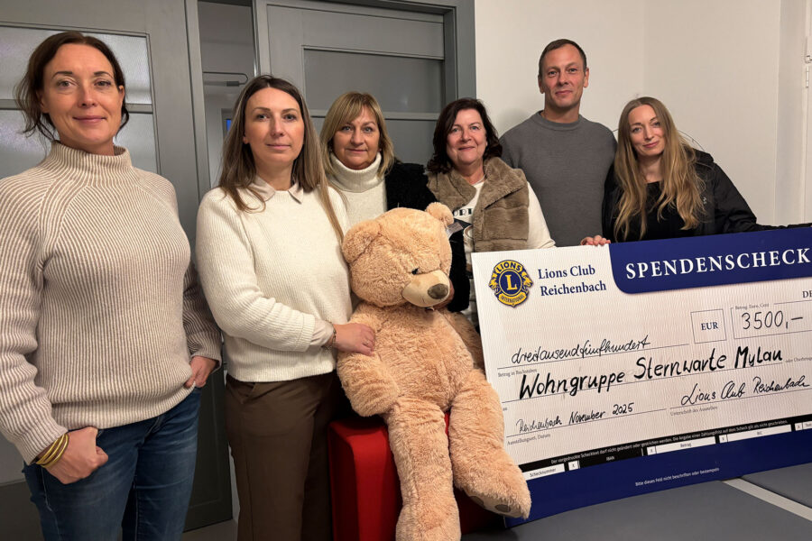 Am 11. November war es soweit und die Lions überreichten den Tombola-Erlös an die Kreativ-therapeutische Wohngruppe Sternwarte Mylau. Christoph Zöbisch und Bianca Böttcher (rechts) freuten sich über die Zuwendung. Von den Lions nahmen die schöne Aufgabe Präsidentin Cornelia Schaller, Martina Müller (links neben Christoph Zöbisch) und Sara Grasnick (links) wahr. Mit dabei war Anika Ludwig, Markt-meisterin der Stadt Reichenbach. Warum? Sie sammelte die tollen Tombola-Preise ein, darunter auch den Riesenbären, den ein Lions-Mitglied gewann und dann den Kindern on top mit überreichte.